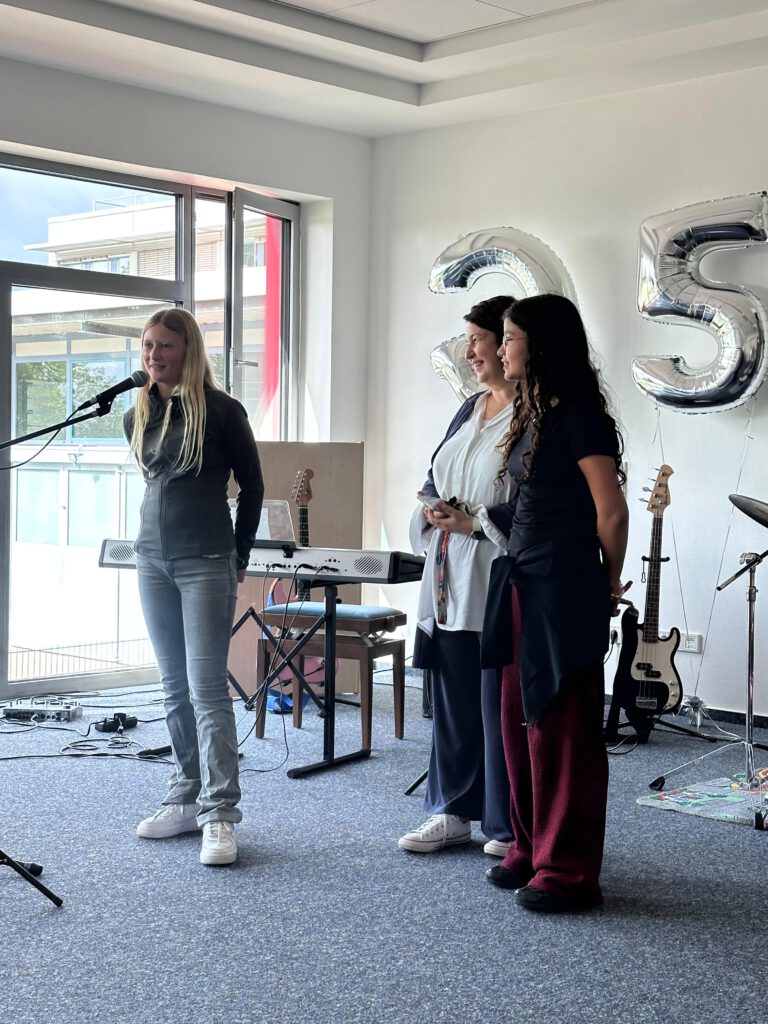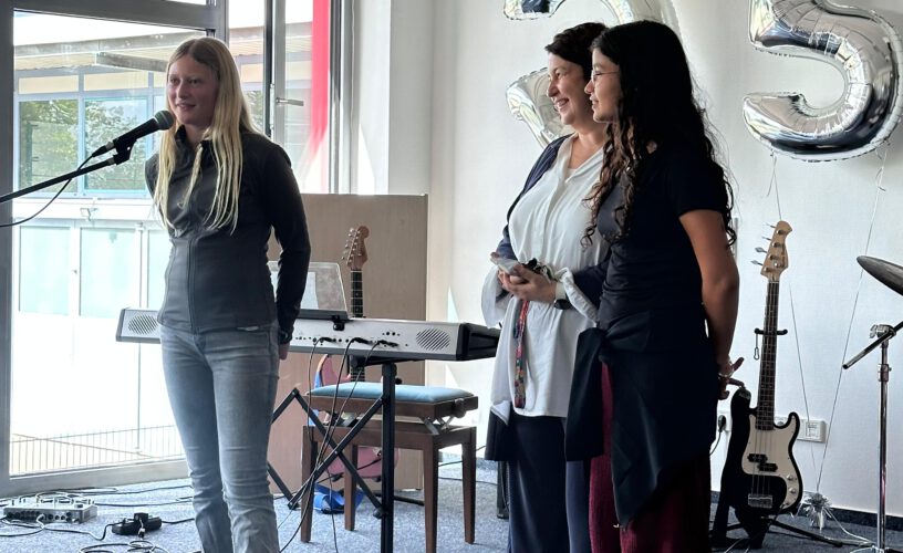 Die Feier wurde musikalisch von unserer Schulband gestaltet. Für einen besonders persönlichen Auftakt sorgten unsere Schülerinnen Ina und Nihal sowie Thilo und Yunus, die die neuen Fünftklässler herzlich willkommen hießen.