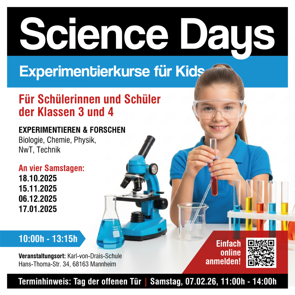 Es ist wieder soweit: Auch im Schuljahr 2025/2026 finden an der Karl-von-Drais-Schule die beliebten Science Days statt. Gemeinsam mit der Pädagogischen Hochschule Heidelberg bieten wir spannende Experimentierkurse für Schülerinnen und Schüler der Klassen 3 und 4 aus Mannheim und Umgebung an.